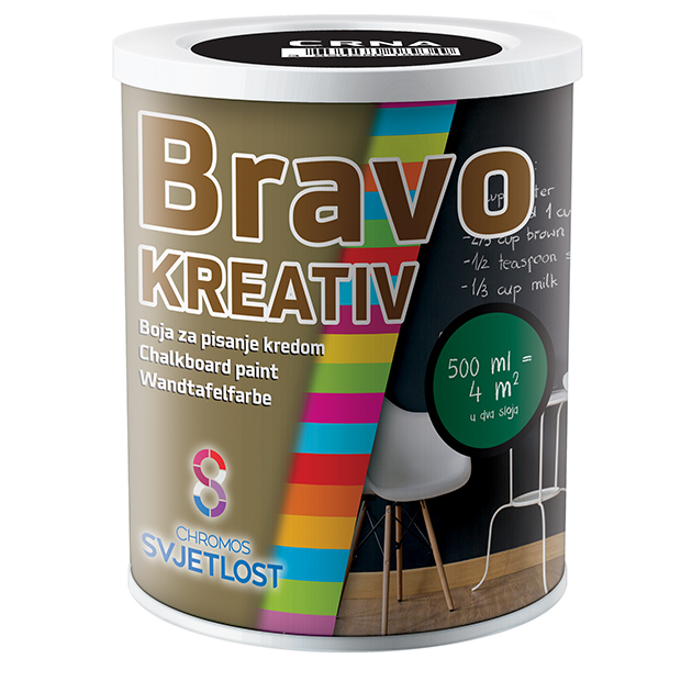 Visokokvalitetna boja za unutarnje zidove na bazi disperzije polimera u vodi, posebno otporna na habanje, koja stvara čvrst i elastičan film. Nakon sušenja prikladna je za pisanje kredom. Obojene površine su posebno otporne na habanje te se mogu prati mekom, vlažnom krpicom. Može se kombinirati u sustavu s temeljnom magnetnom bojom Bravo magnetic, čime se postižu magnetska svojstva i perivost završnog suhog filma.